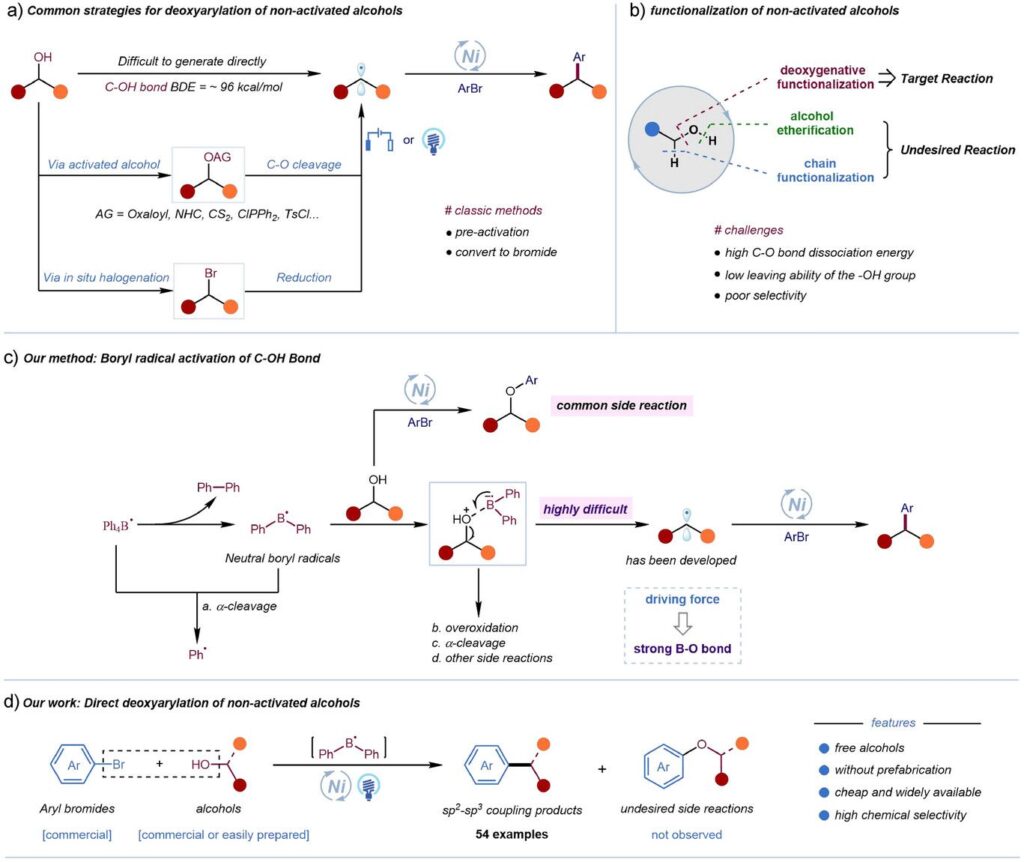 Until now, direct activation of the C─O bond was an unresolved problem, mainly due to high dissociation energy (approximately 96 kcal/mol) and the limited dissociation capacity of the hydroxyl group.