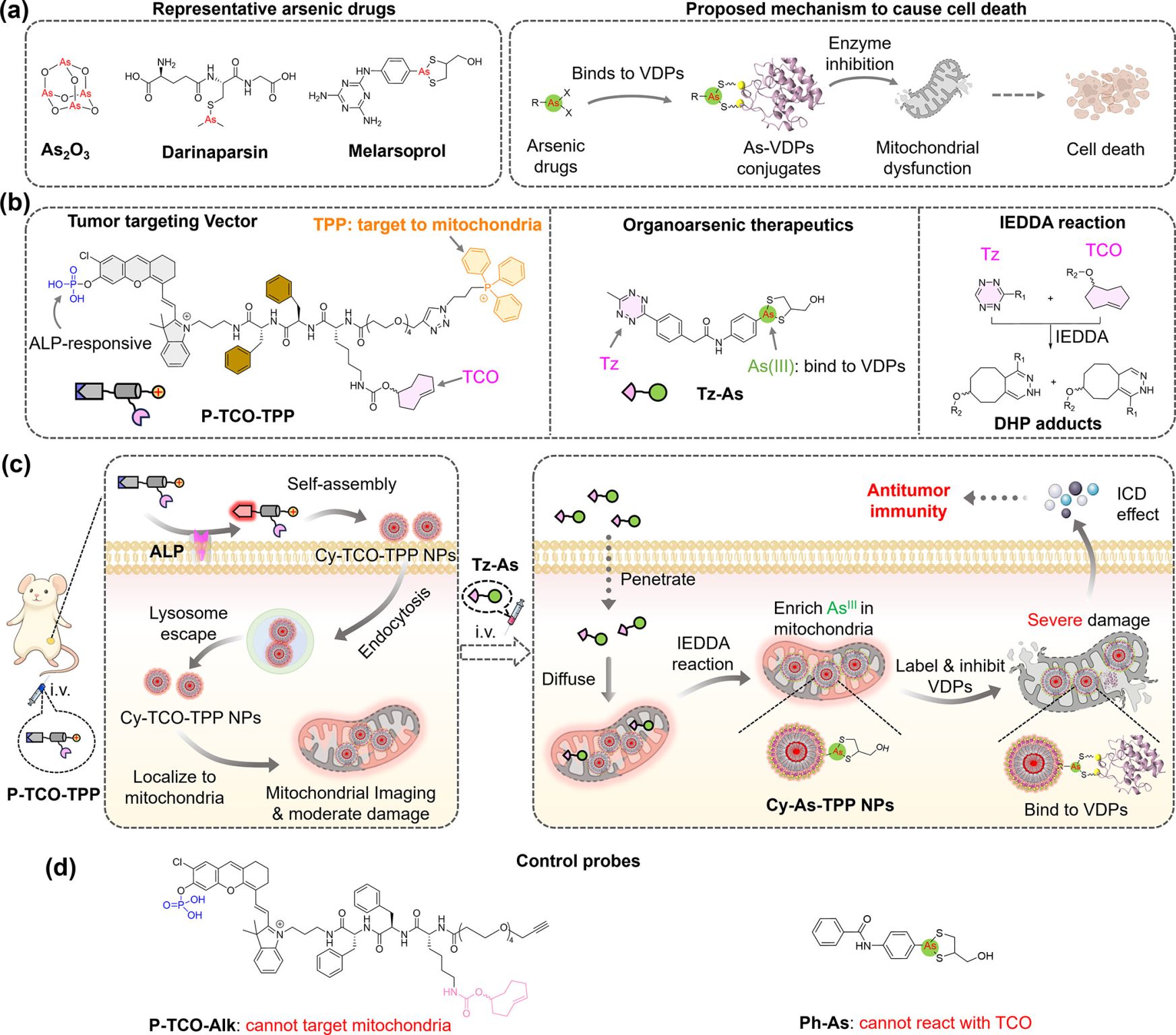 4๏ธโฃ Guided by mitochondrial NIR fluorescence, Tz-As is injected at the optimal time to react via IEDDA (inverse demand Diels-Alder reaction) with mitochondrial Cy-TCO-TPP NPs, producing intramitochondrial arsenic nanoparticles.